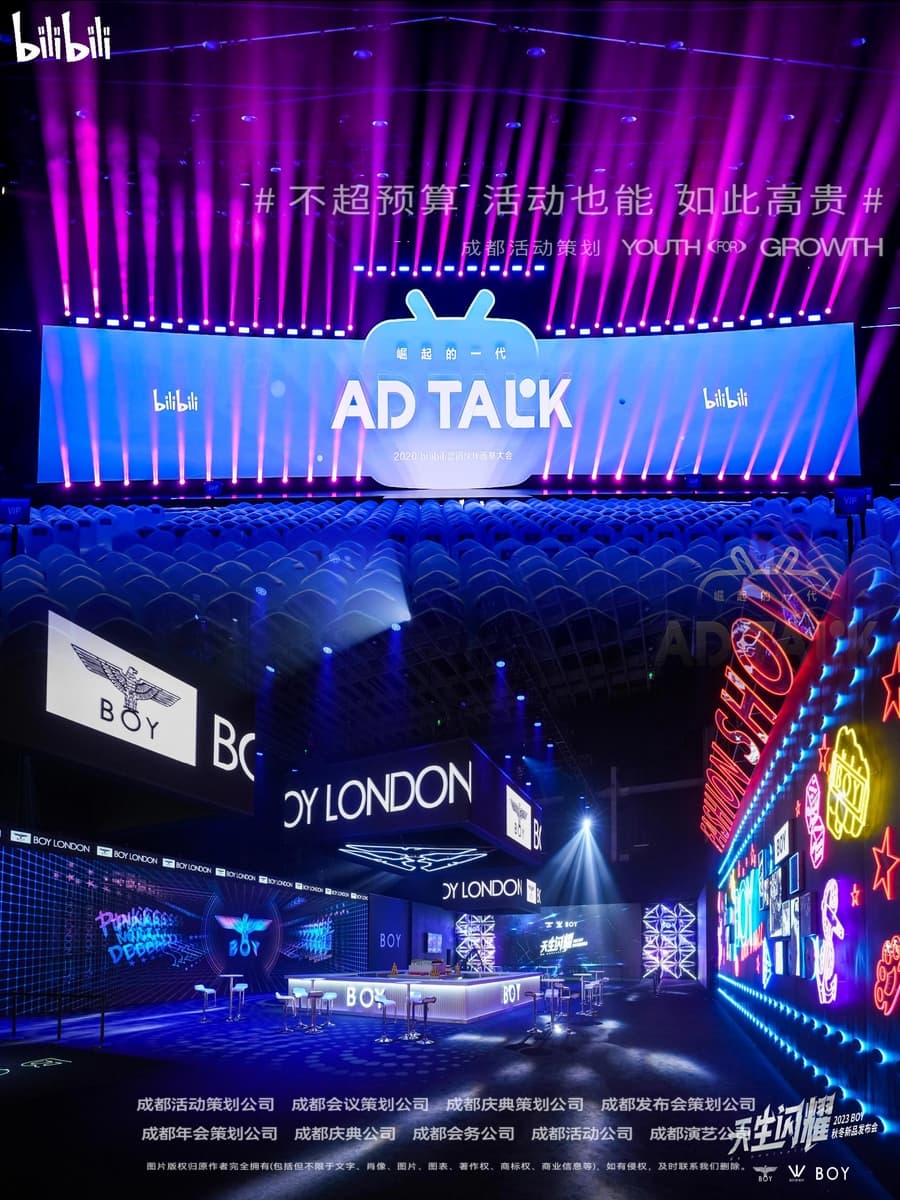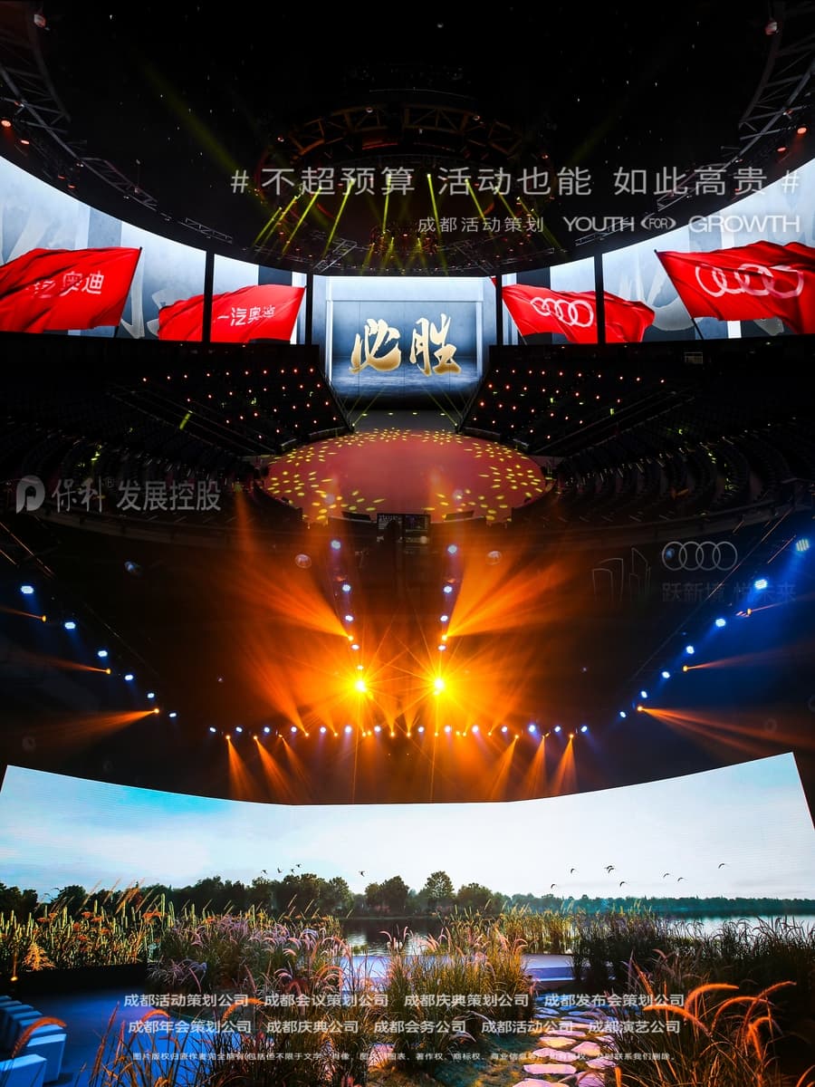 舞台、背景板、签到区、灯光音响、主题装饰等,打造与企业文化相符的年会氛围;